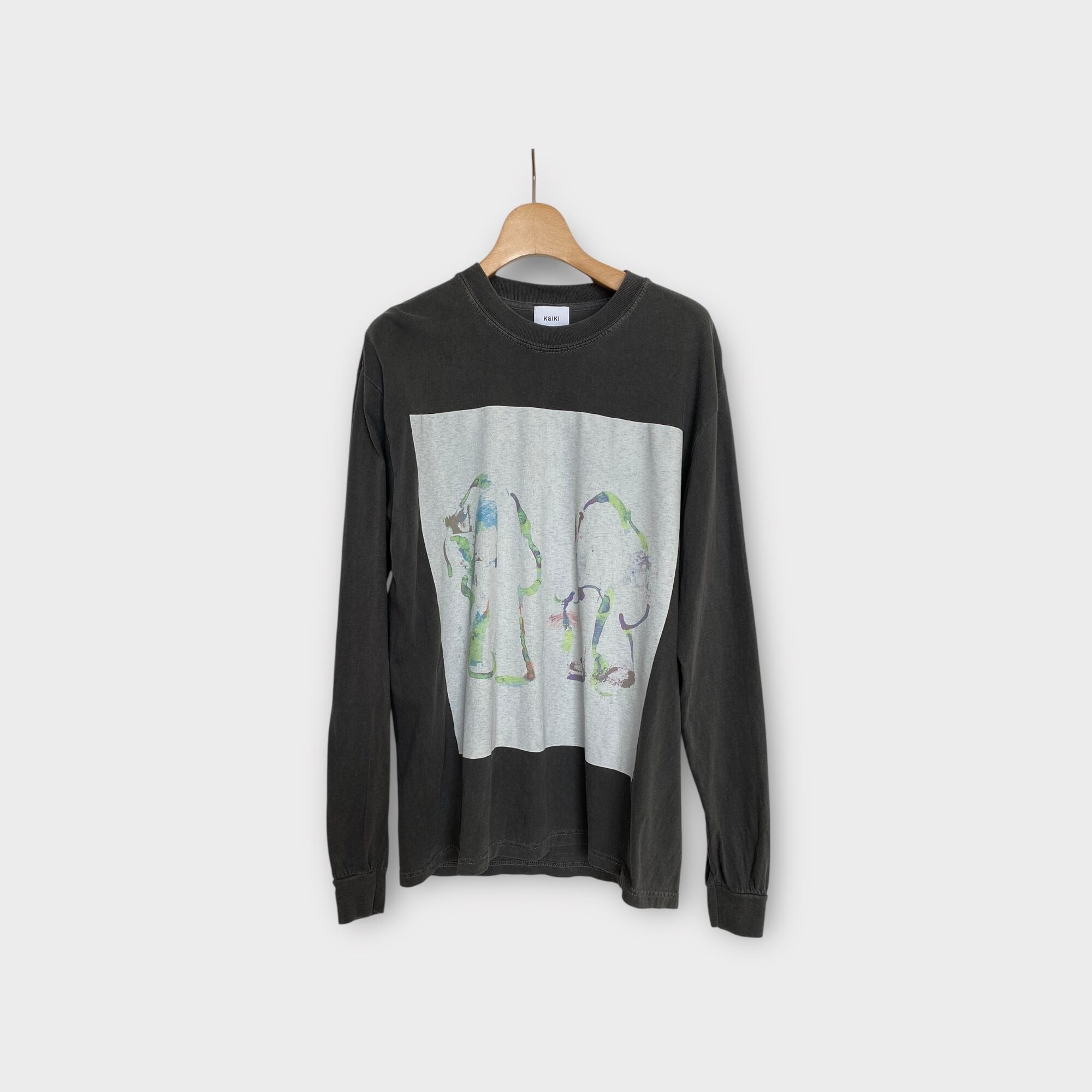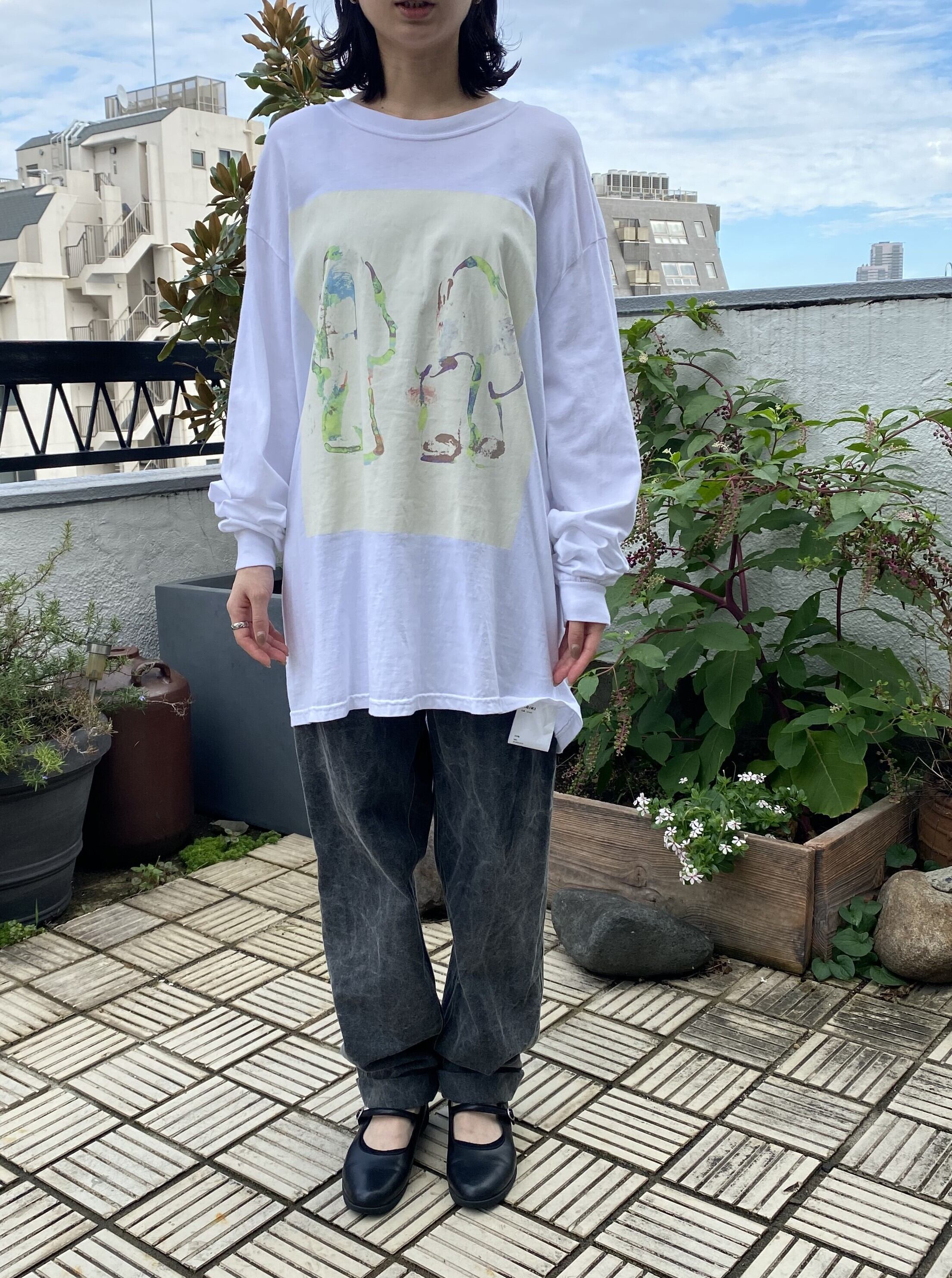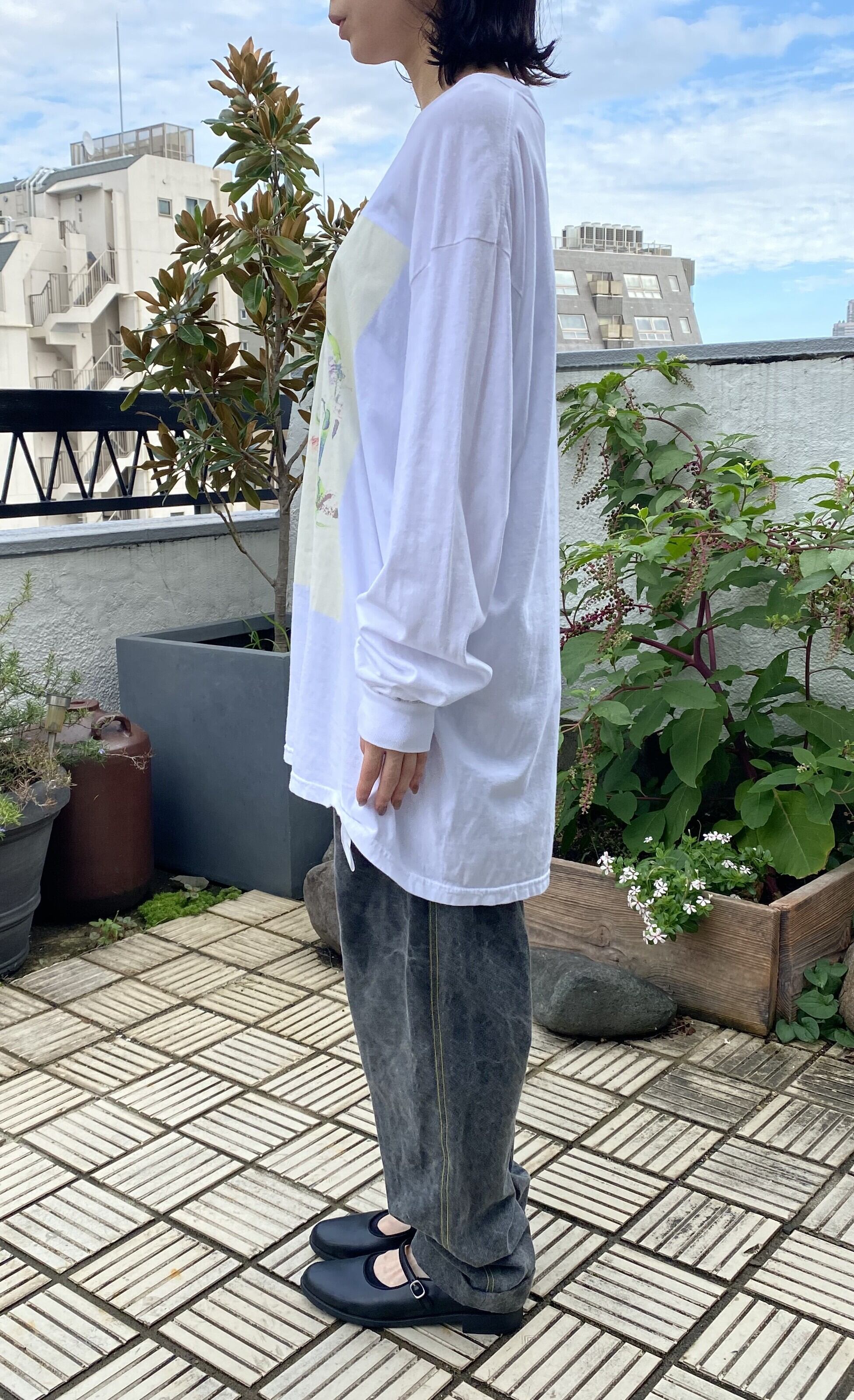 ヴィンテージライクロングスリーブTシャツは、長袖仕様でハードな洗い加工をすることでヴィンテージ風の雰囲気を持つ一枚です。手作業で施されたクラックプリントが特徴で、オリジナルプリントです。