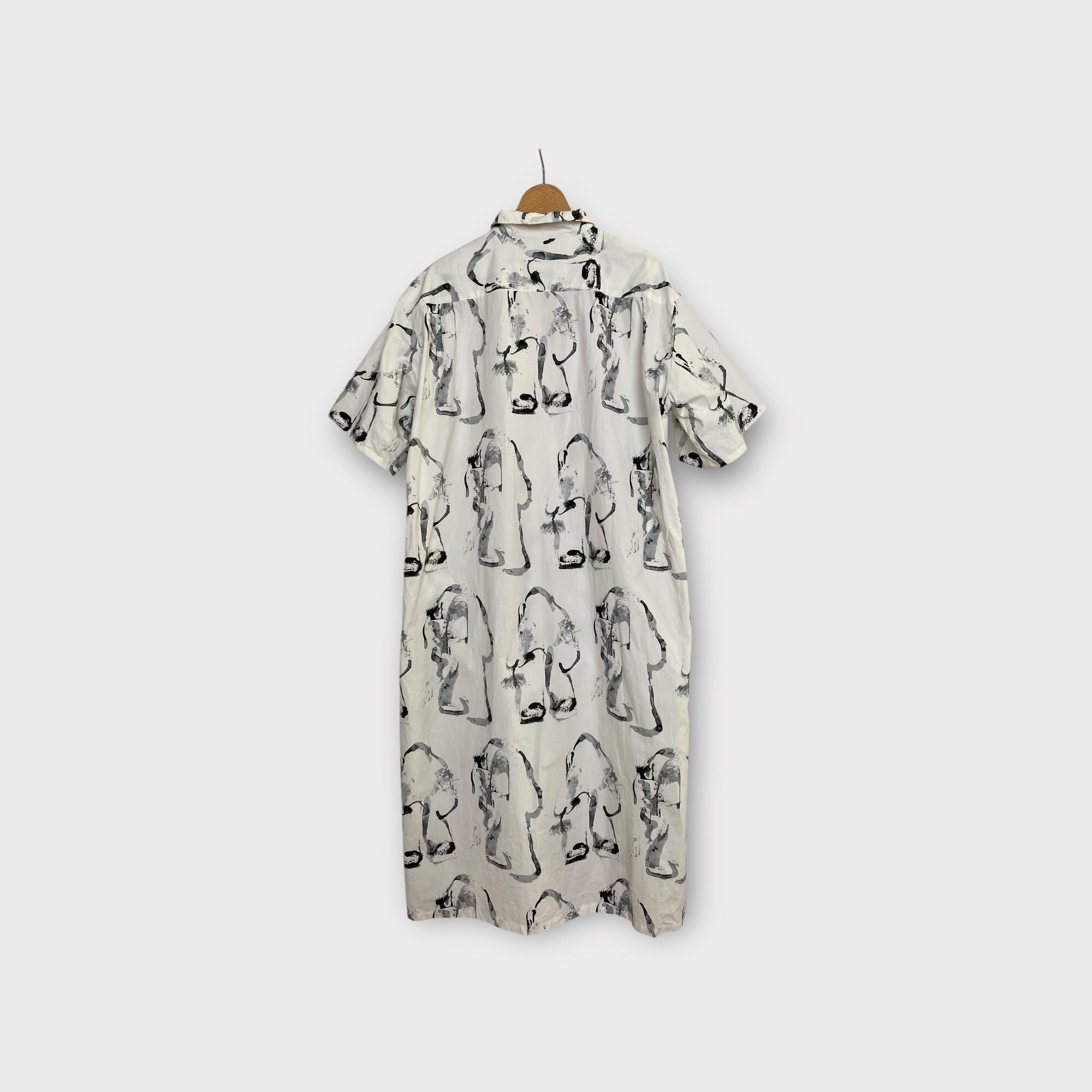 プリントショートスリーブシャツワンピースは、オリジナルプリントと和紙混の生地で仕立てられた軽やかな着心地のアイテムです。ハリのある素材感が特徴で、サイドポケット付きのデザインは、実用性も併せ持っています。