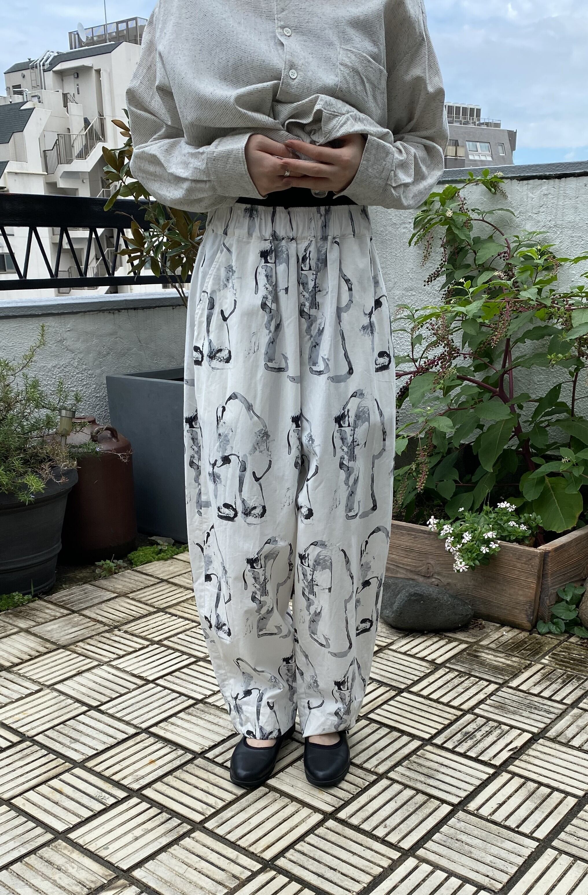 プリントワイドパンツは、オリジナルプリントと和紙混の生地で軽やかに仕立てられた魅力的なアイテムです。ハリのあるシルエットが特徴で、リラックスした着心地ながらもスタイリッシュさを兼ね備えています。