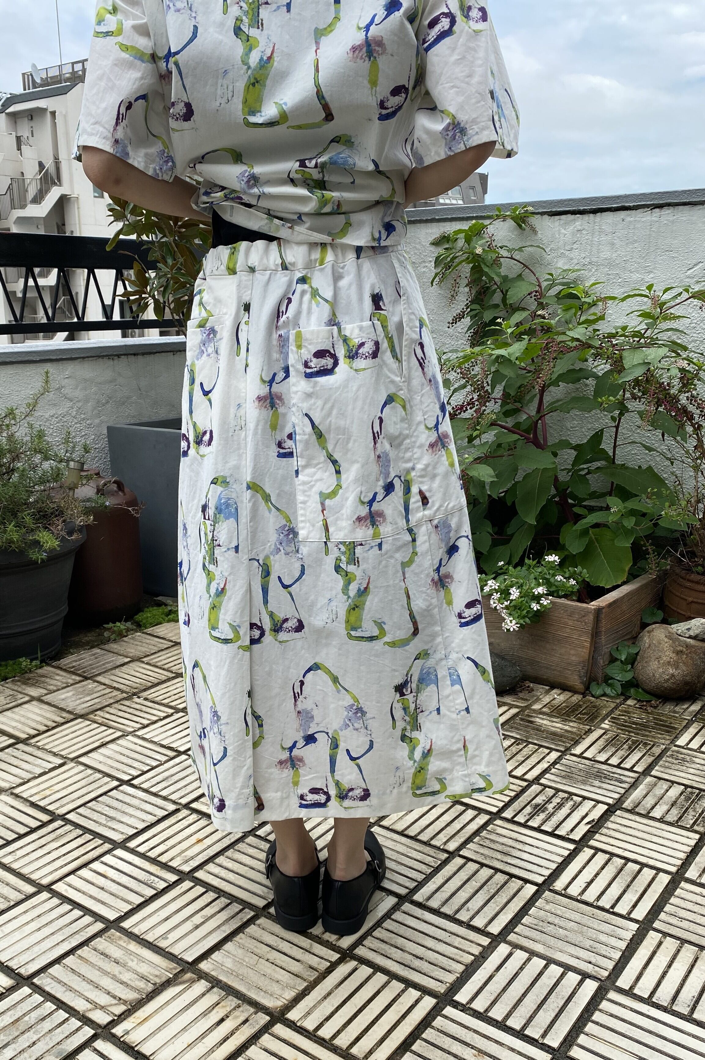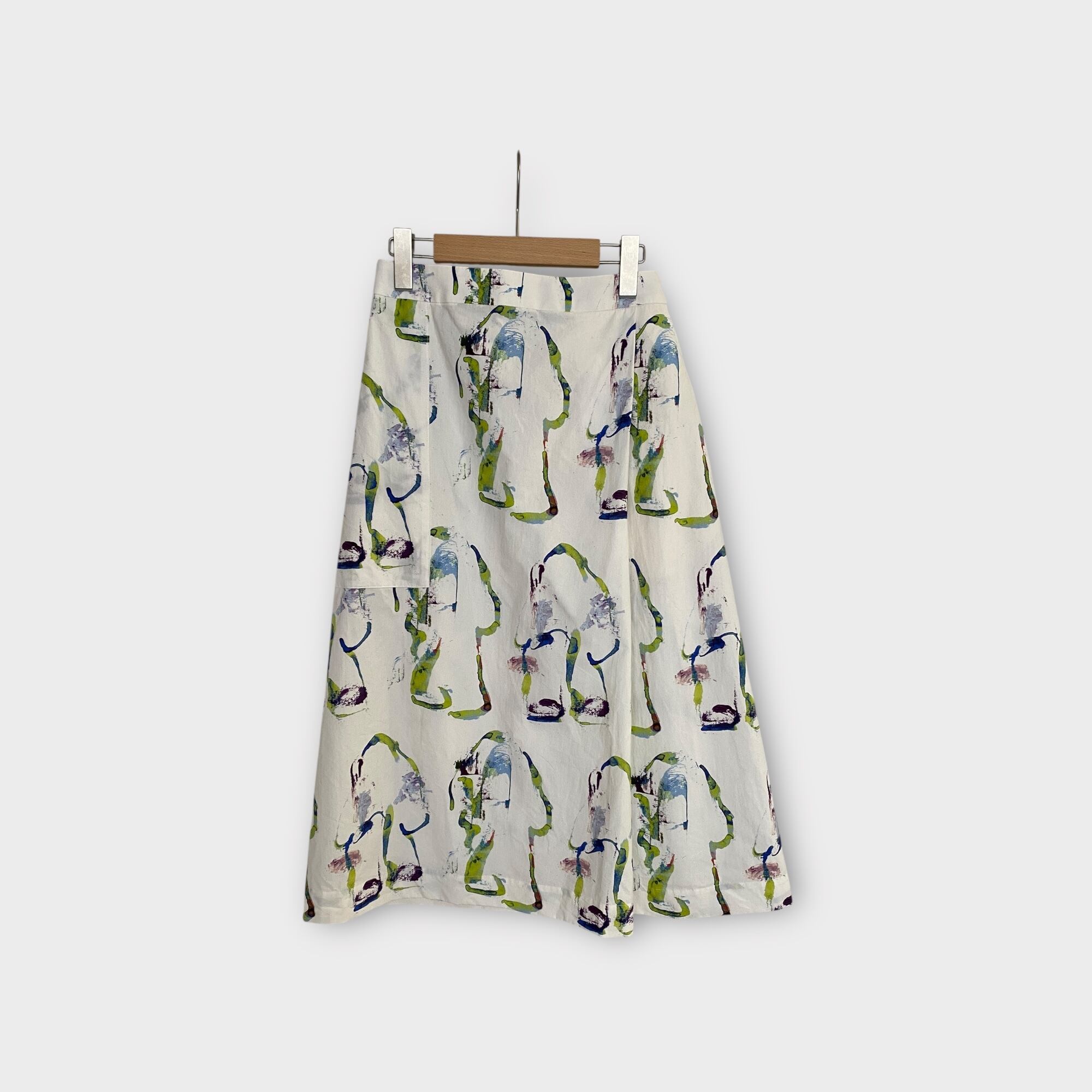 プリントラップスカートは、オリジナルプリントが施されたデザインと、和紙混の生地で軽やかに仕立てられた魅力的なアイテムです。特徴的なハリ感あるシルエットは、アシンメトリーなデザインによって、スタイリッシュながらもリラックスした雰囲気を演出します。さらに、パッチポケットがアクセントとなり、実用性も兼ね備えた一枚です。