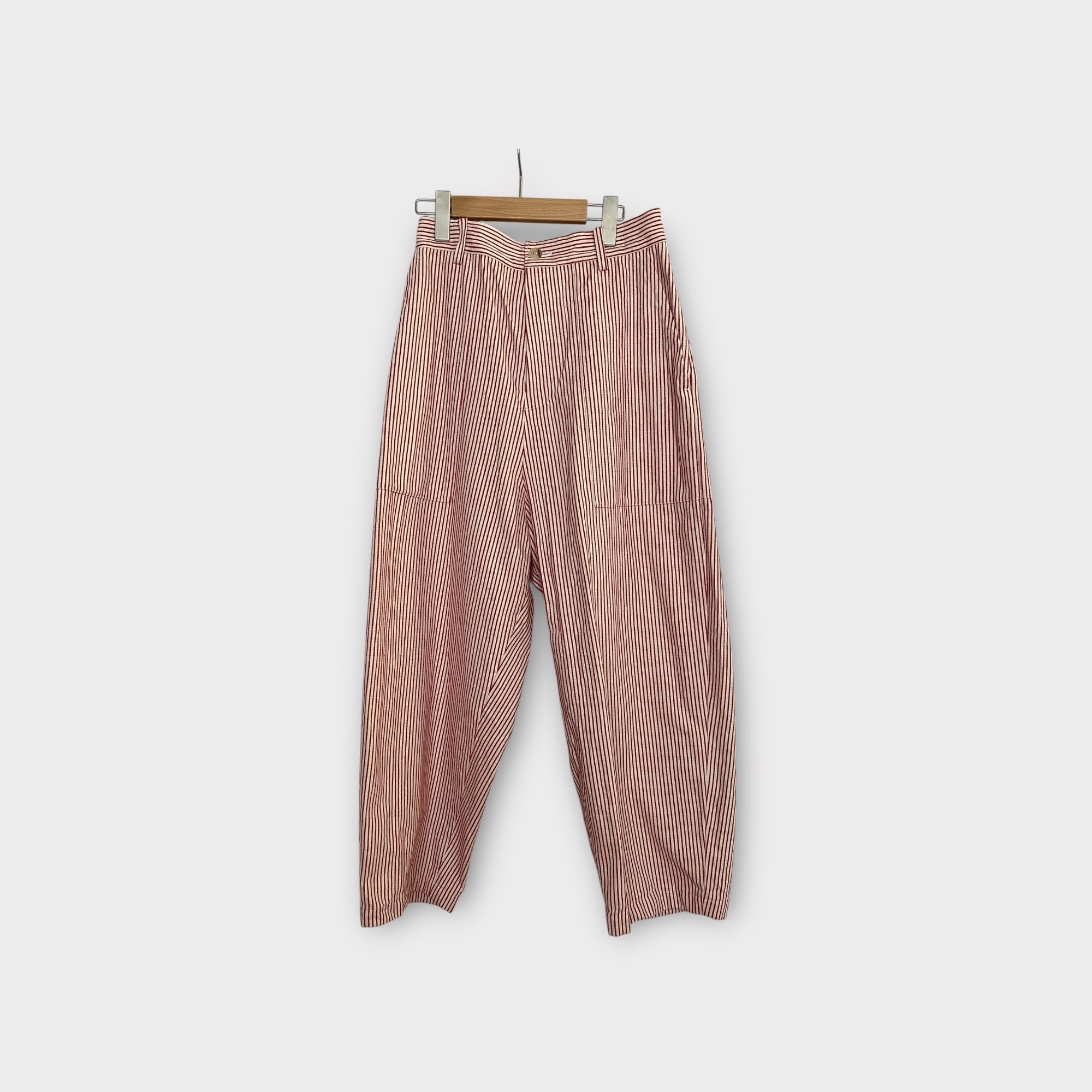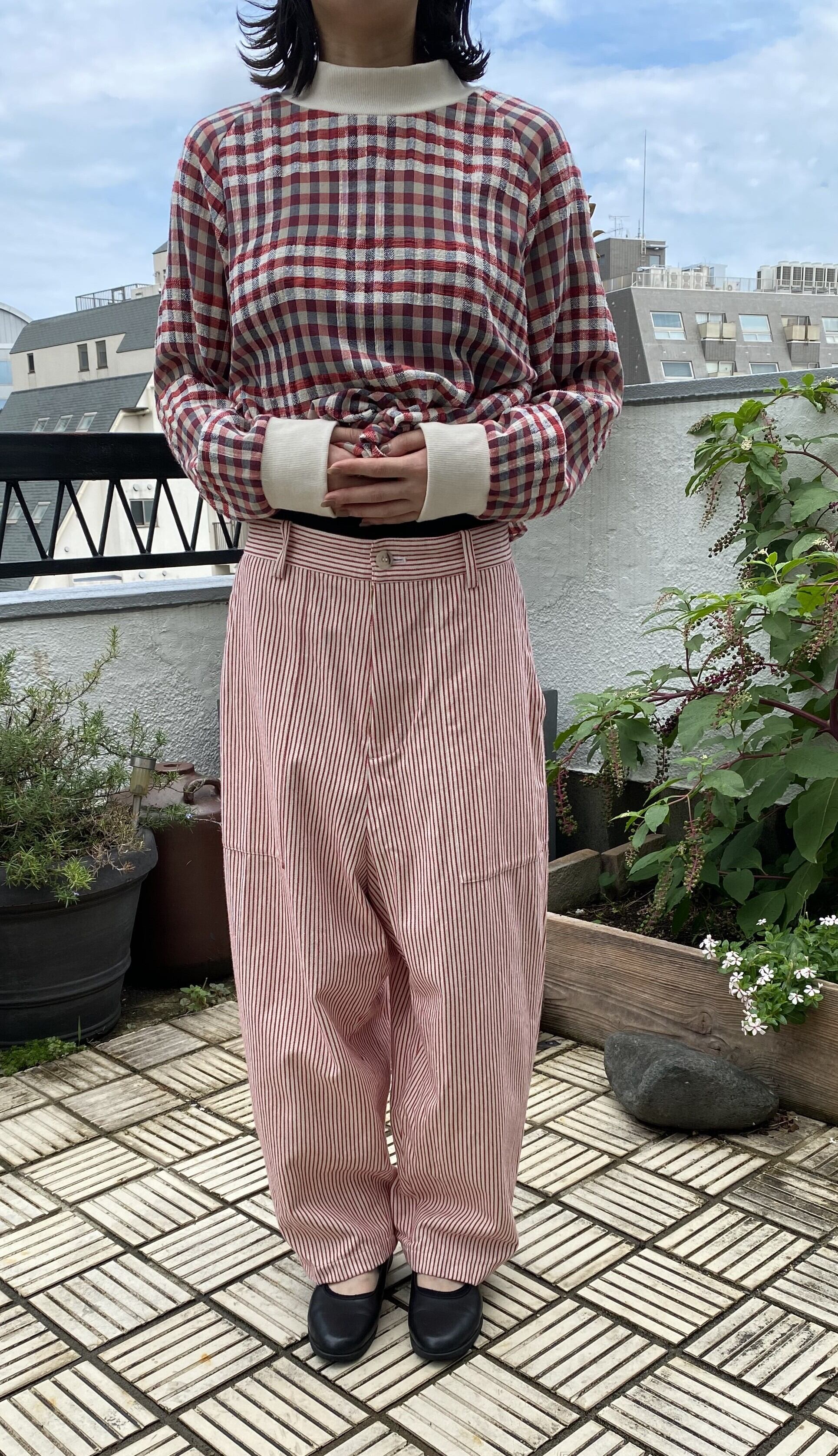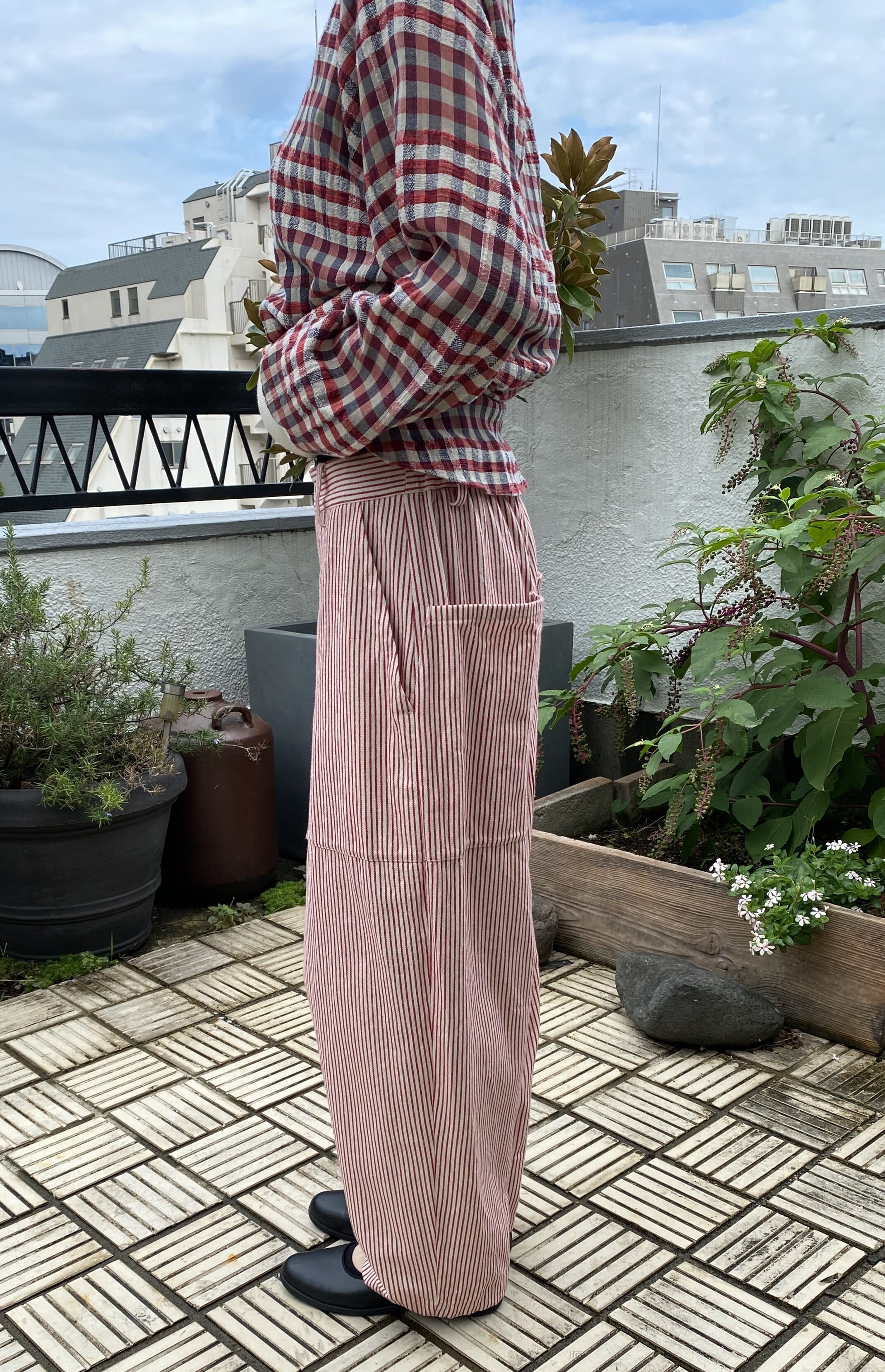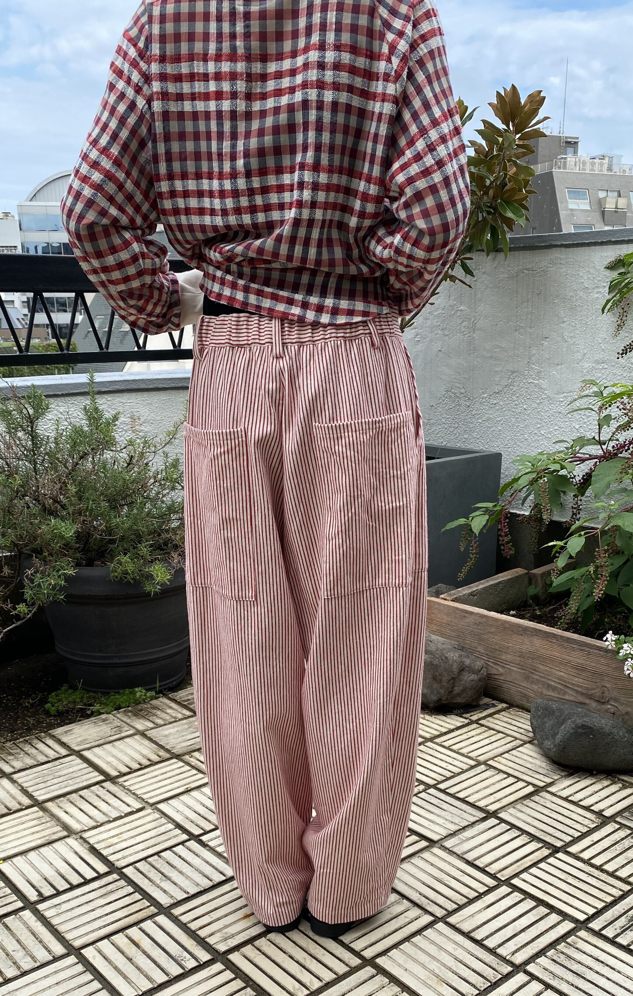 ヒッコリーサルエルパンツは、細かいストライプが入った中肉のツイル生地を使用した魅力的なアイテムです。程よい厚さのため、春夏秋冬を通じてお楽しみいただけるため、オールシーズン活躍します。また、股上が深いデザインで、ワークウェアのようなベイカーポケットがアクセントとなり、カジュアルなスタイルからお出かけまで幅広くコーディネートが可能です。